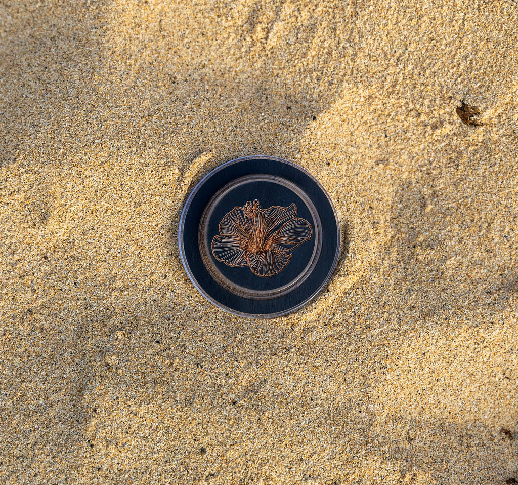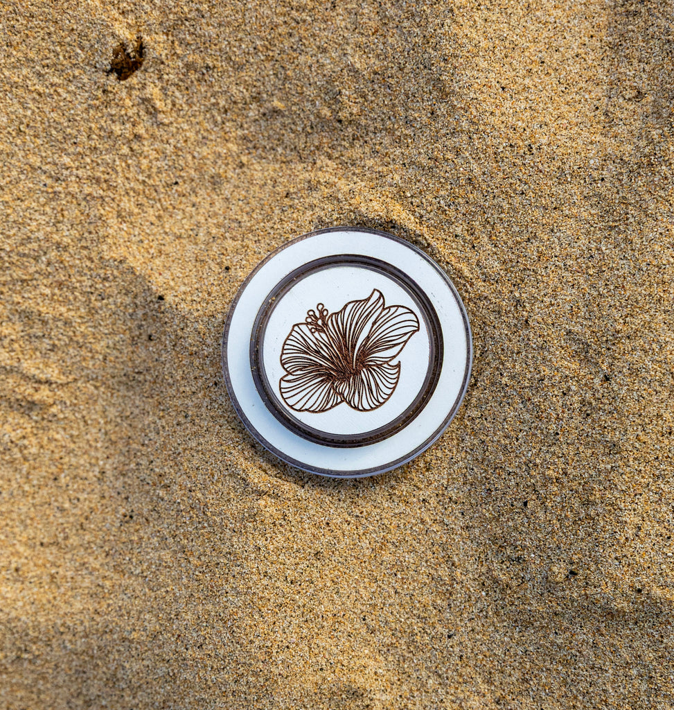 This hibiscus MagSafe phone grip comes in three colors, brown wood, black wood and white wood and it features the  Hawaiian state flower, a Hibiscus etched in wood.